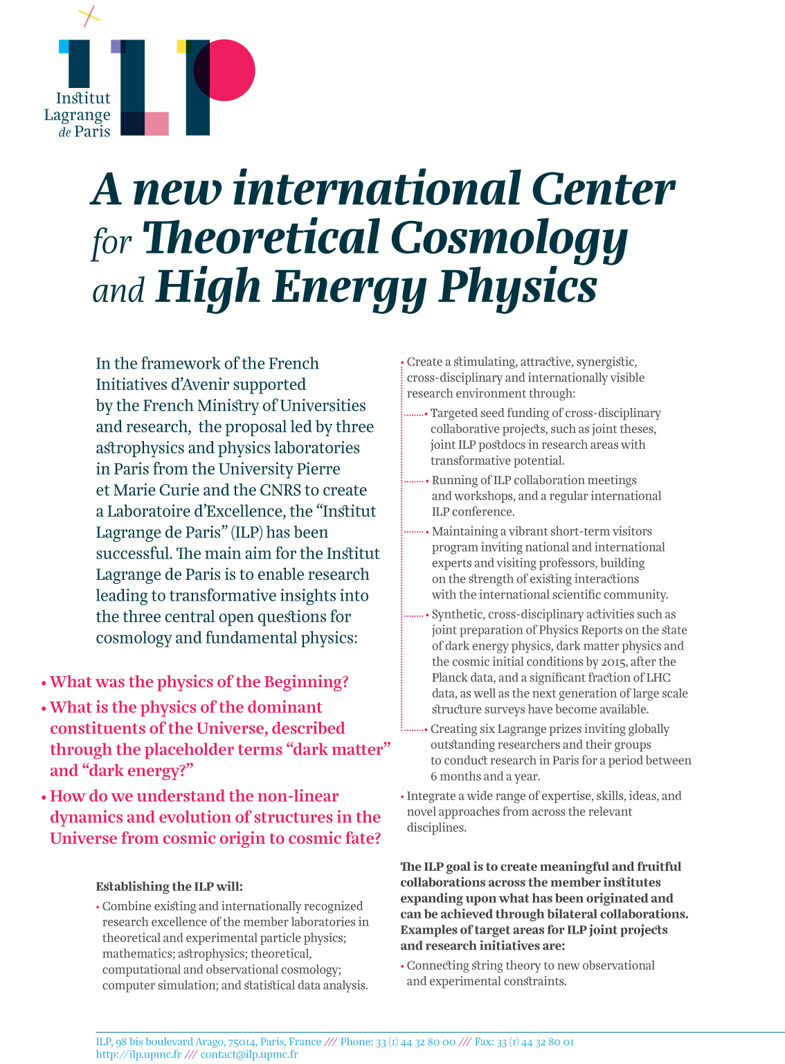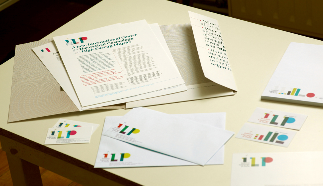 Création de l'identité visuelle de l'ILP, institut d'astrophysique spécialisé dans les recherches sur la matière noire. La clef de cette piste est de faire apparaître des espaces par déduction. Les formes sont superposées avec des transparences en produit. Ainsi la somme des couleurs réunies en crée de nouvelles. La forme en découpe connote la matière invisible. Elle symbolise également la pièce manquante du puzzle, celle qui permettrait de comprendre l’univers : l’objet de la recherche.