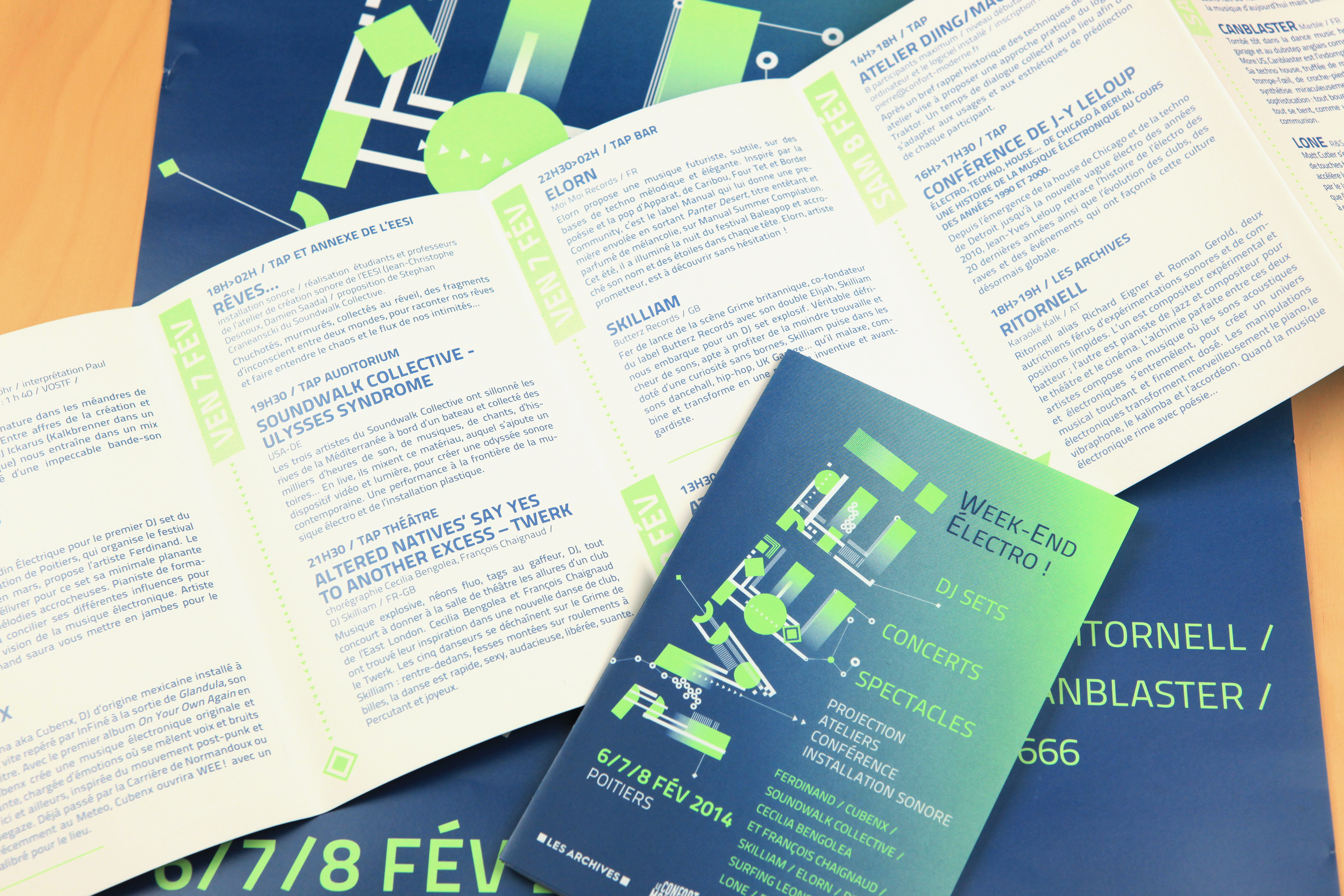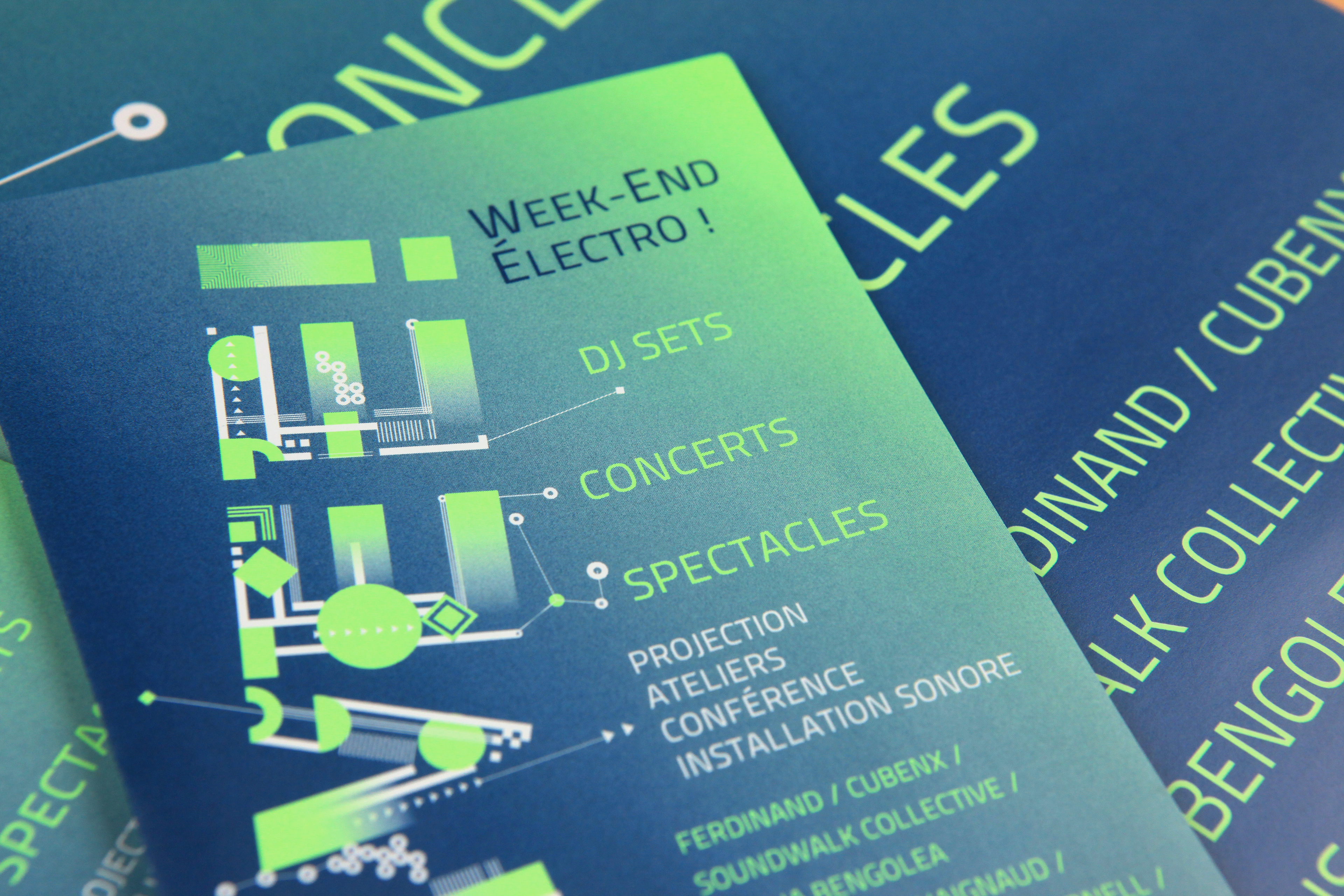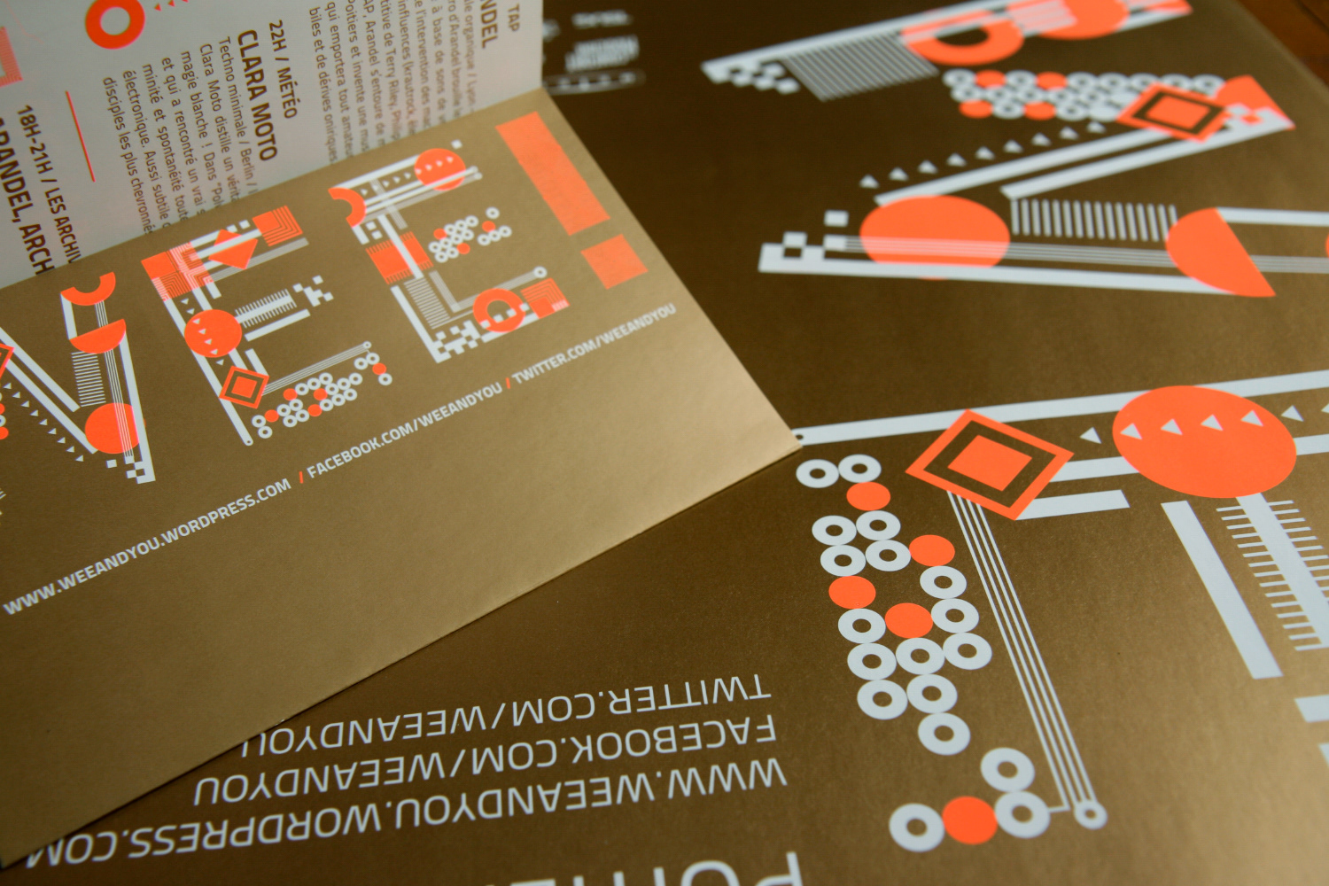 WEE! est un Week-End Électro annuel organisé par le TAP – Scène Nationale de Poitiers, Le Confort Moderne, Les Archives et Le Meteo. Cet événement se déroule chaque année sur les 4 lieux. L'identité visuelle se décline selon les éditions en une bichromie différente composée d'un pantone fluo et d'un pantone métallique. La typo reprend l'idée schématique du circuit électronique avec des mises en lumière fluo sur certains éléments. Déclinaisons sur affiches, programme, site wordpress, ID facebook, etc. Communication des éditions 2013 et 2014.