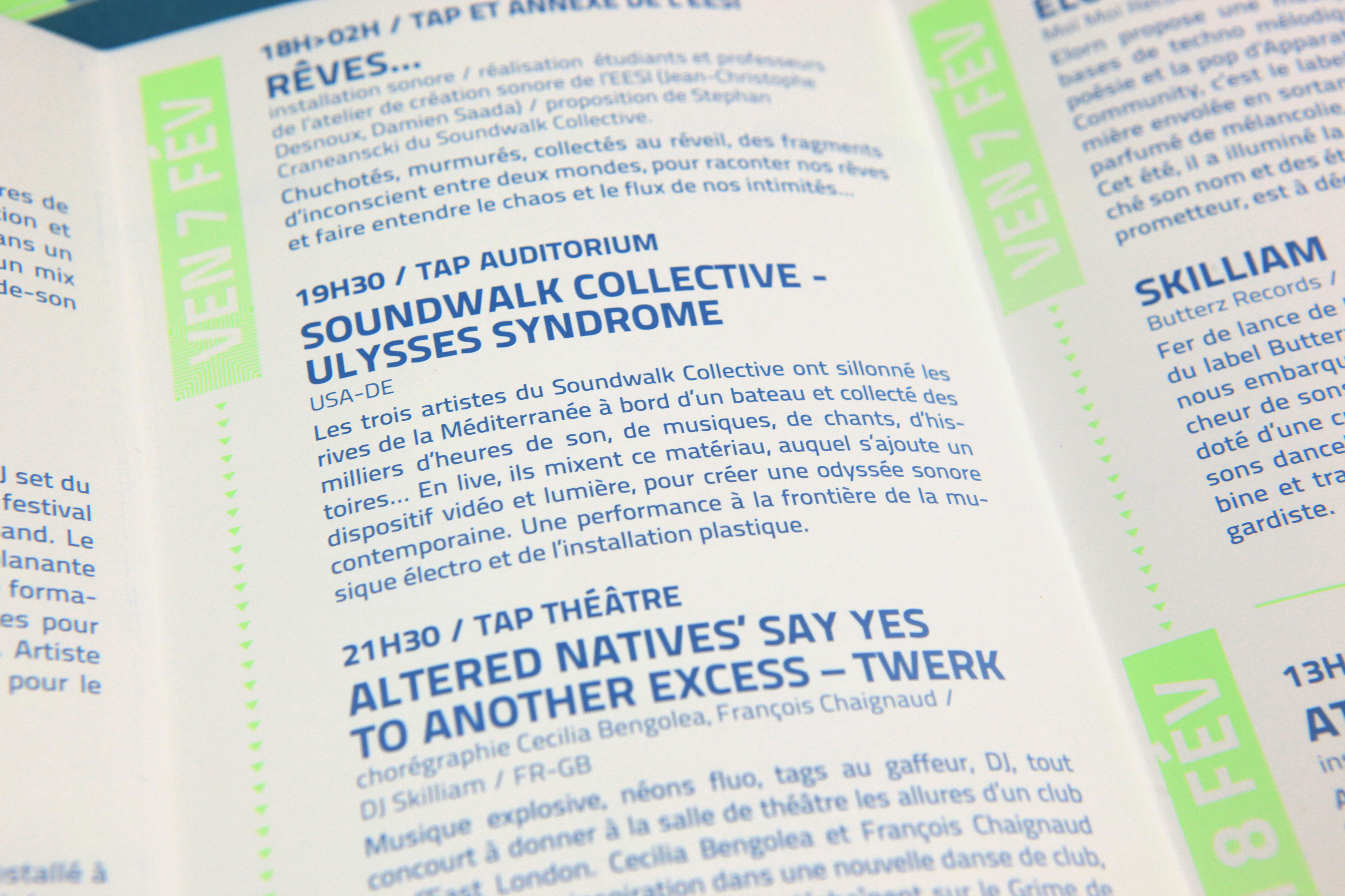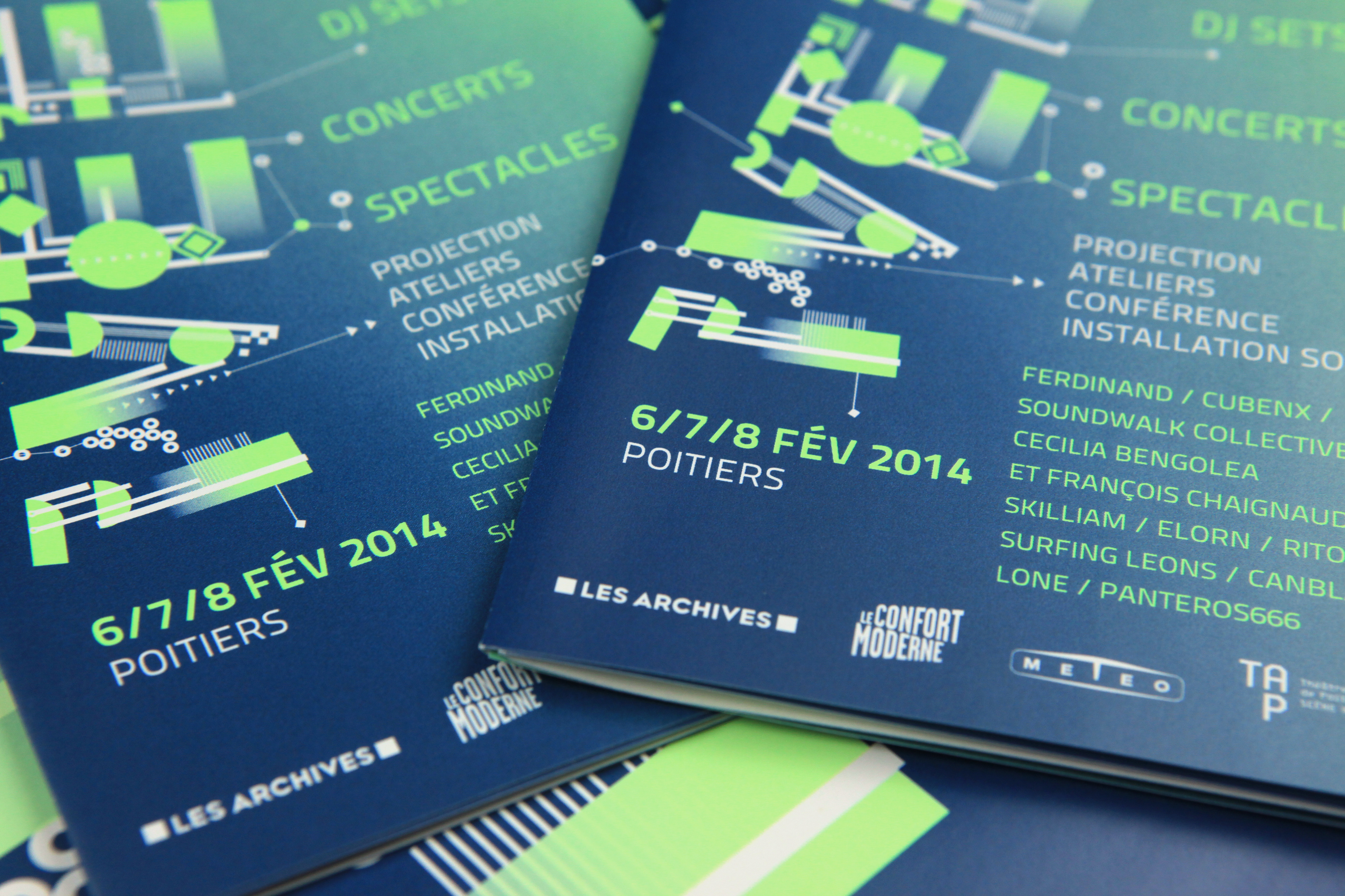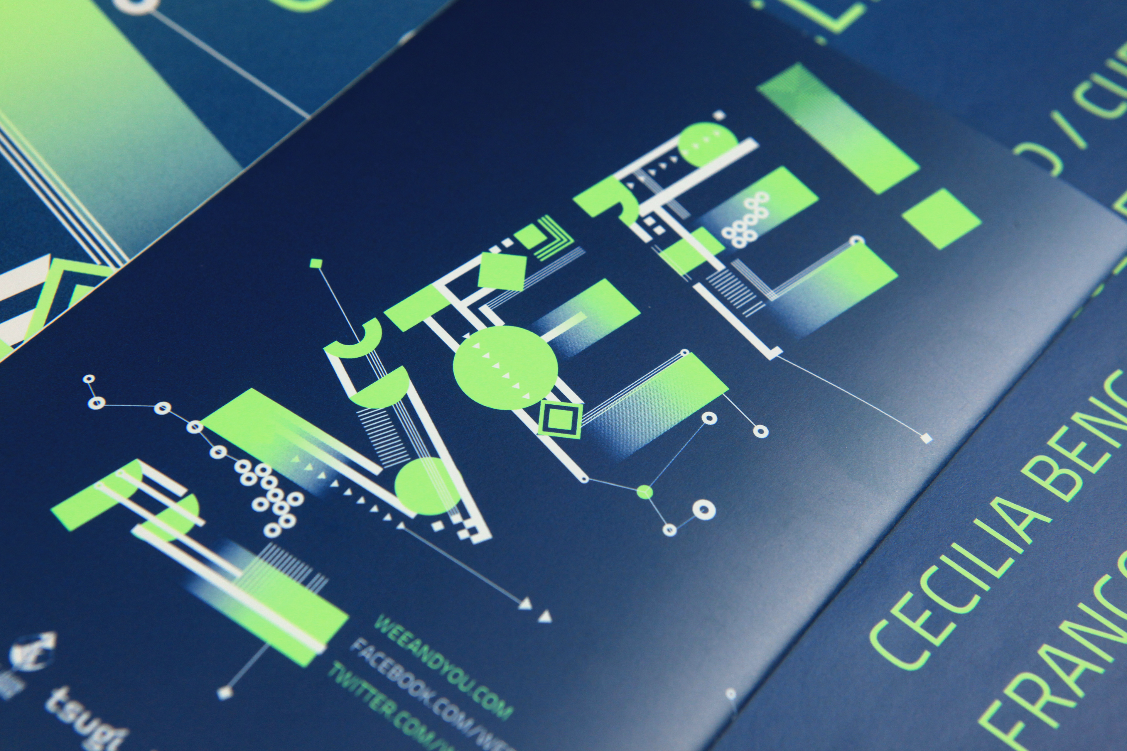 WEE! est un Week-End Électro annuel organisé par le TAP – Scène Nationale de Poitiers, Le Confort Moderne, Les Archives et Le Meteo. Cet événement se déroule chaque année sur les 4 lieux. L'identité visuelle se décline selon les éditions en une bichromie différente composée d'un pantone fluo et d'un pantone métallique. La typo reprend l'idée schématique du circuit électronique avec des mises en lumière fluo sur certains éléments. Déclinaisons sur affiches, programme, site wordpress, ID facebook, etc. Communication des éditions 2013 et 2014.